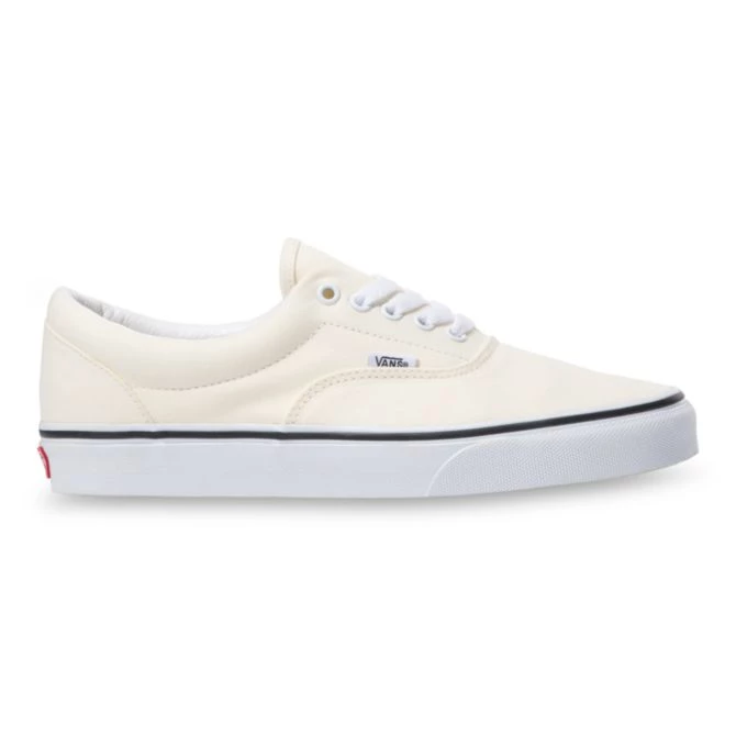 The Era, the Vans classic low top skate shoe, features sturdy canvas uppers with metal eyelets, padded collars for support and flexibility, and signature rubber waffle outsoles.