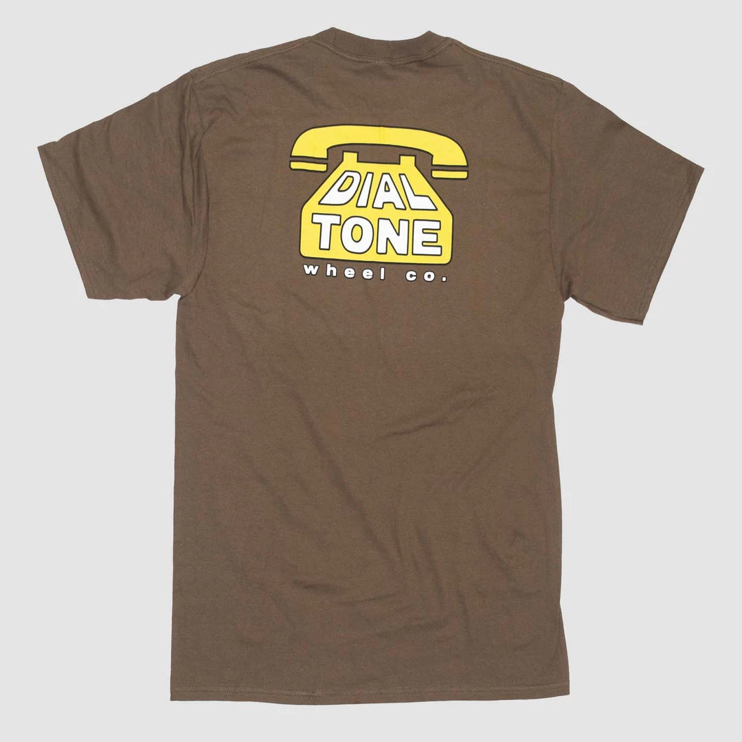 The Dial Logo Tee from Dial Tone Wheel Co. features a small left chest print and a large back print of the classic Dial insignia in khaki on a unique tar colored tee.