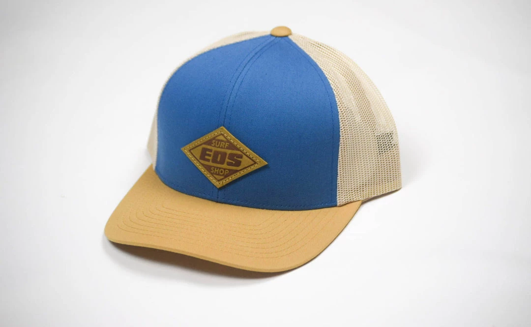 EOS trianlge stamp hat, custom embossed leather patch on an adjustable mesh back hat.