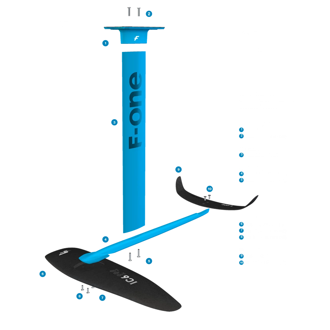 The fuselage and mast are made of aluminium. The mast plugs directly into the fuselage and, at the top, a 4-bolt plate that can be plugged in to get the foil compatible with any board fitted with tracks. Alternatively, a selection of optional standards like KF, DeepKF or Tuttle heads is also available.