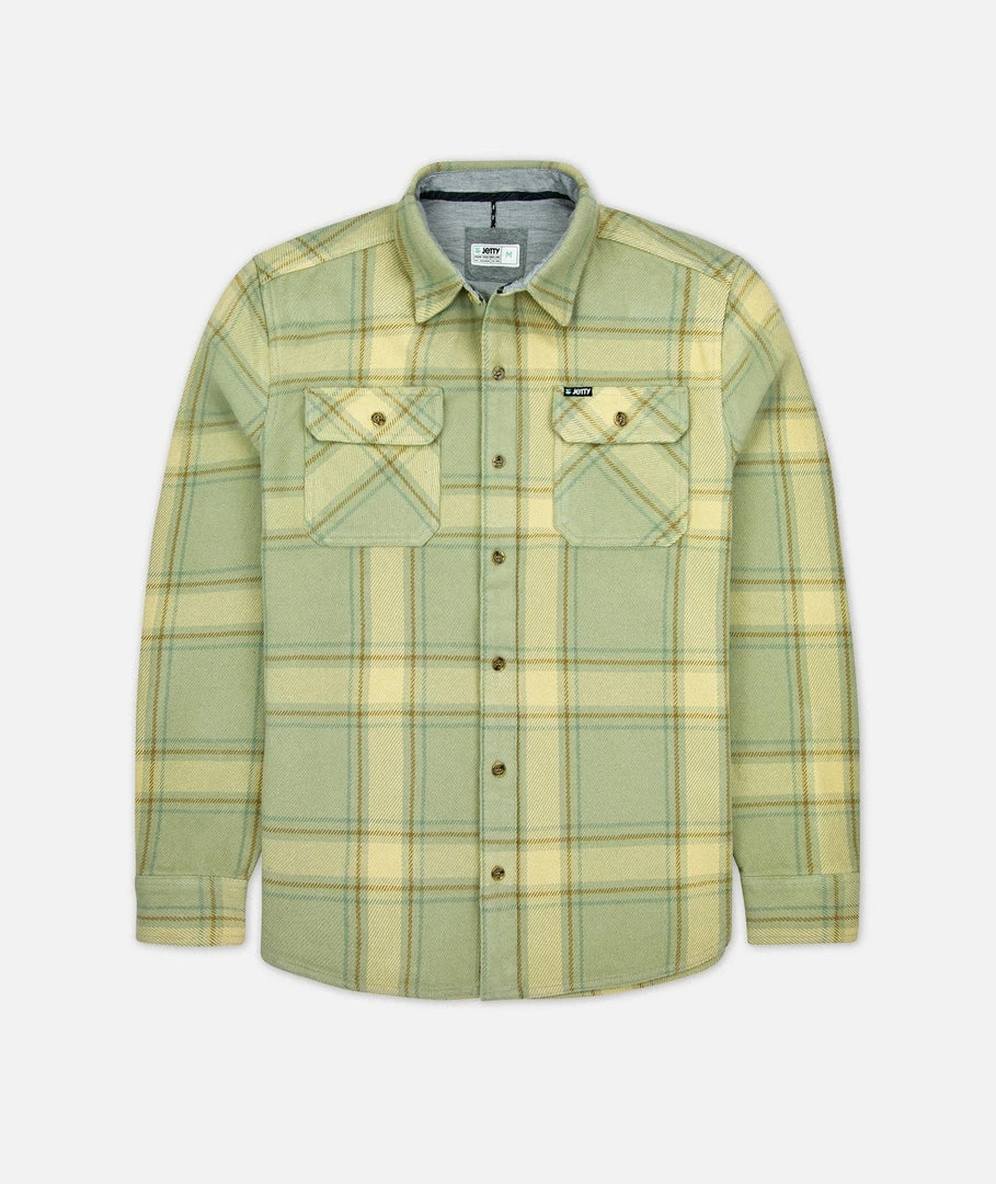 The Arbor features a mid-weight durable woven twill fabric, laser engraved buttons, large double chest pockets with Otis Pillar flaps, scallop side-seams with contrast fabric detail, custom labeling at neck, inner-placket, and chest pocket. Designed at Jetty HQ