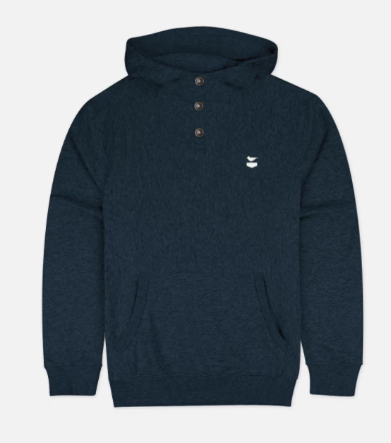 60% Cotton, 40% Polyester Special Blend Loopback Terry. Made in the USA! This three button henley pullover hoodie is proudly made in California, using a super high quality loop back terry fleece fabric that has an amazing texture and hand. Features custom embossed metal buttons, and Jetty Otis embroidery at left chest.