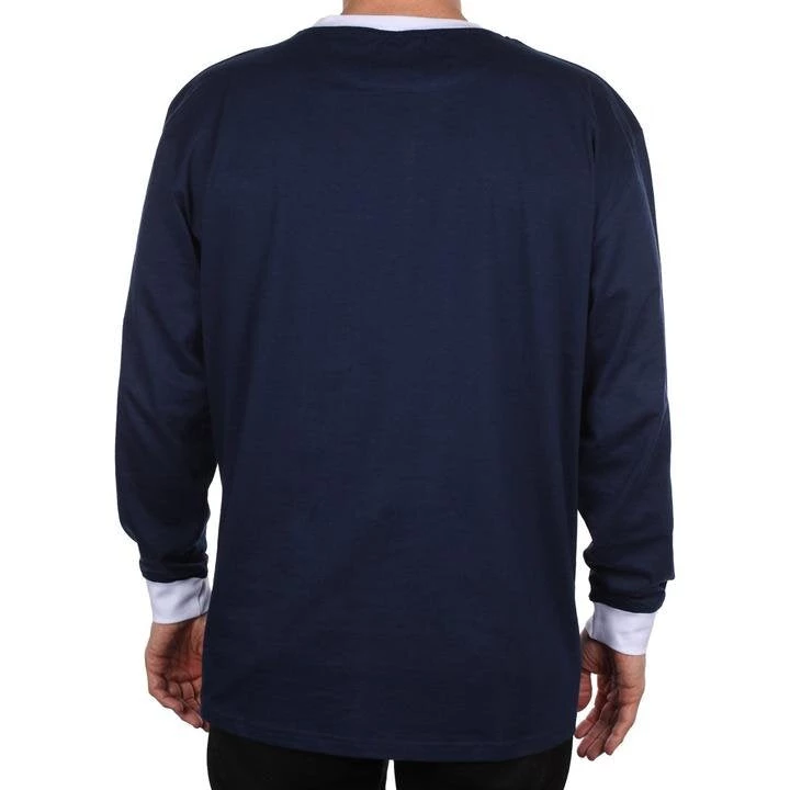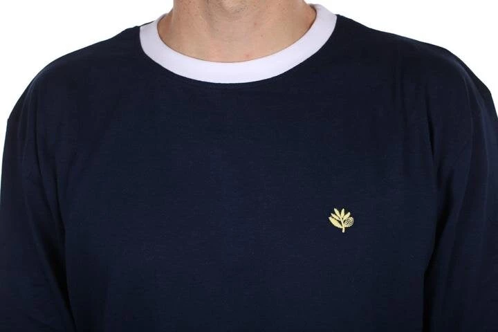 Magenta’s Brode Long-Sleeve features a small yellow plant logo on the front chest of a navy longsleeve with white cuffs.