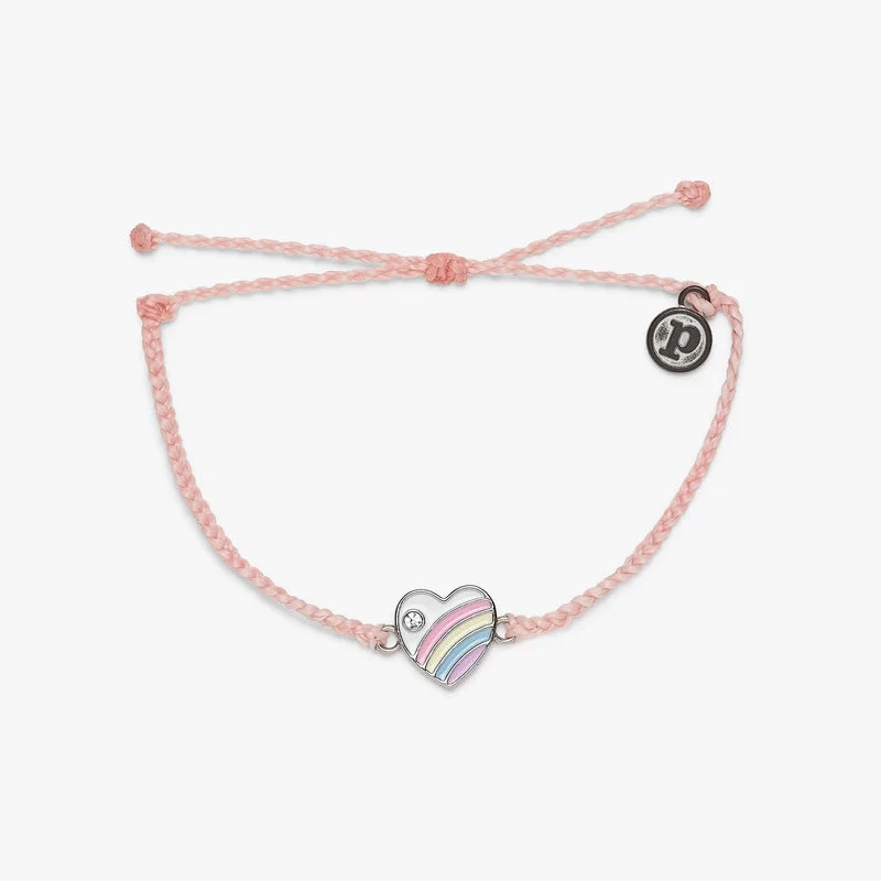 We’re throwin’ it back to ‘70s style with our Pastel Vintage Heart Charm Bracelet. Available in shades of seafoam green or baby pink, this bitty braid style features an enameled rainbow heart charm, with a tiny glass stone for a hint of sparkle.