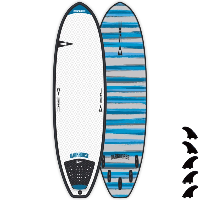 The all-new SIC Darkhorse is stepping up the game with its Vortex™ construction fusing the highest quality soft board technology with composite stringers and lightweight core materials to create fun and yet high-performance boards. The Darkhorse features a EPS core, the bottom and top skin are ultra-high-quality Vectra Ply reinforced polyethylene to promote speed, stiffness and durability. The rails are a high-density EVA to increase durability while being low friction, so they are comfortable on your arms when paddling. A key differentiating factor and core performance characteristic of the SIC Darkhorse is its Dullies™ (dual glassed reinforced composite rail stringers). This gives the board its unique stiffness without sacrificing its lively feel and pop! These boards are equipped with FCS Fusion compatible fin boxes and allow you to run the board as a quad or tri fin setup in the 5’8” and 6’8” lengths and a tri fin setup for the 7’4 and 8’4 lengths.