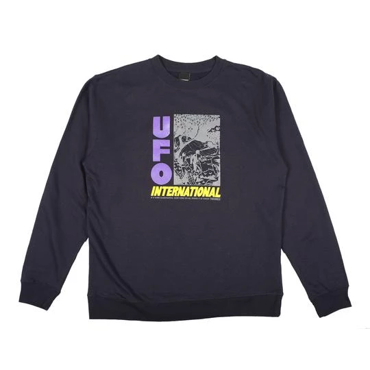 The UFO International Crewneck features a front graphic with quote at bottom “If it were imagination, how were we all seeing it at once. THEORIES.”